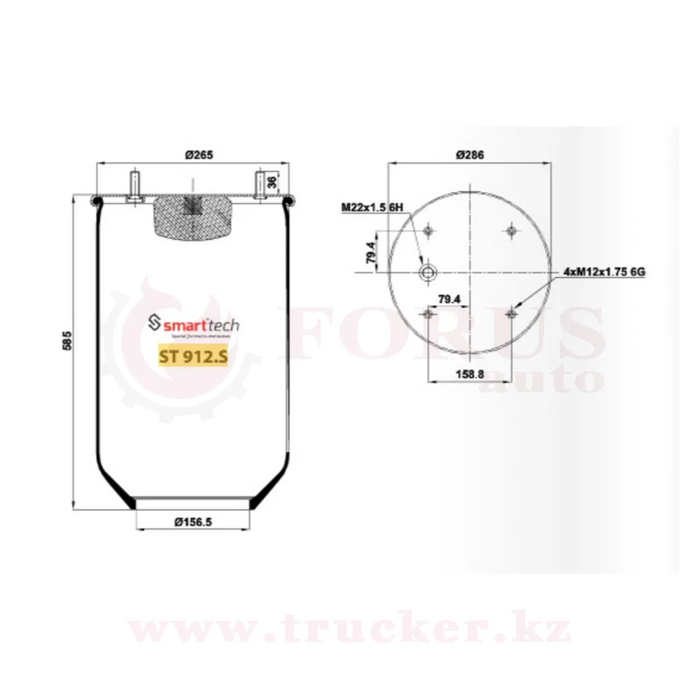 Пневмоподушка 912 N P02 без мет. стакана, крышка на 4 шпильки и 1-отверстие M22x1.5 (SAF, Meritor)